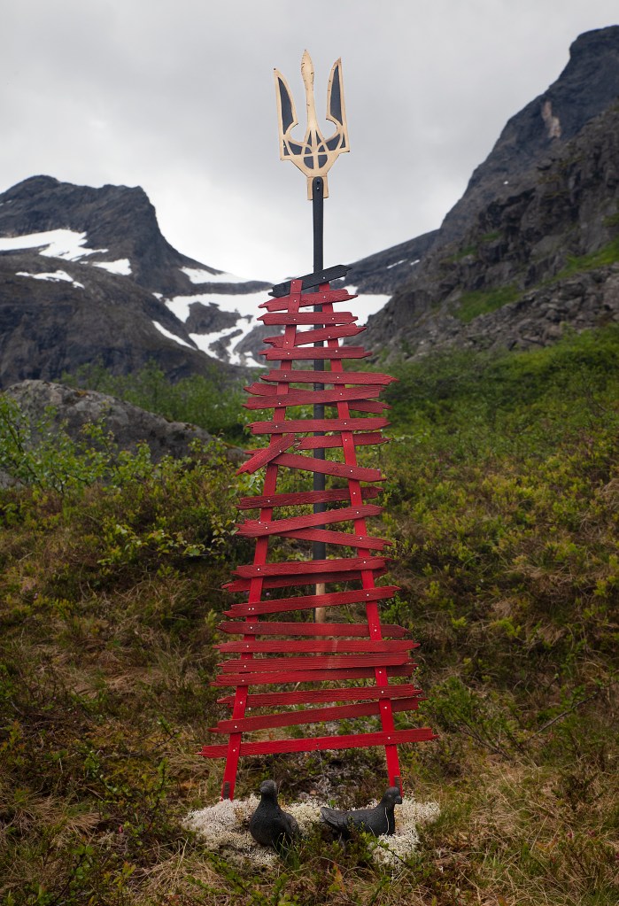 My work in Art in Nature 2022 is called ”Broken honor” and is colored by Russia’s unjust war against Ukraine. Which has affected me deeply so no other theme was possible. The struggle for freedom for the Ukrainian people and their right to choose their own path towards democracy and independence. This is the entrance to my installation on Litlefjellet which consists of to parts. the crashed landmark ” broken honor” and the symbol of Ukraine that will win in the end with justice and the guardian angels on its side.