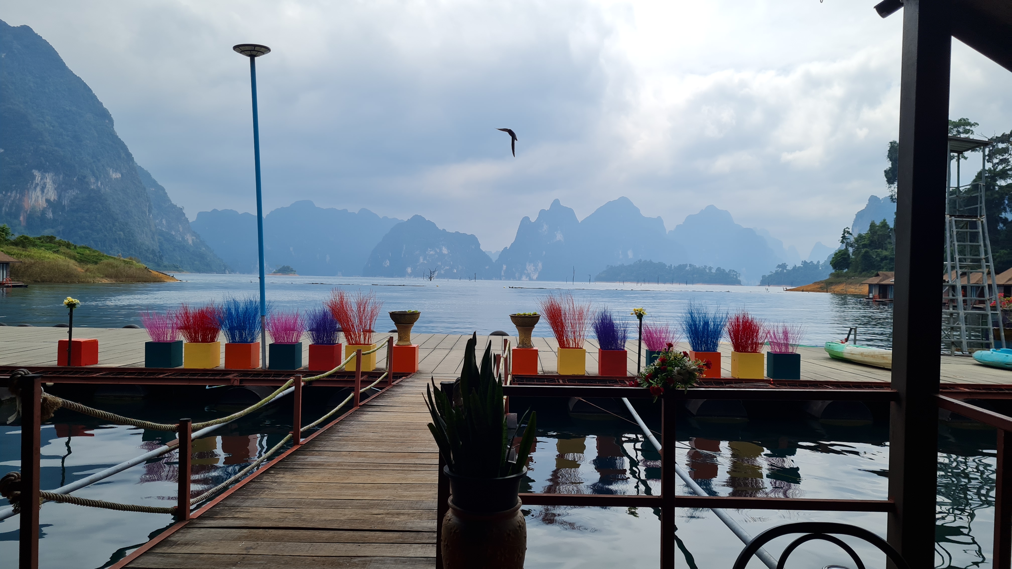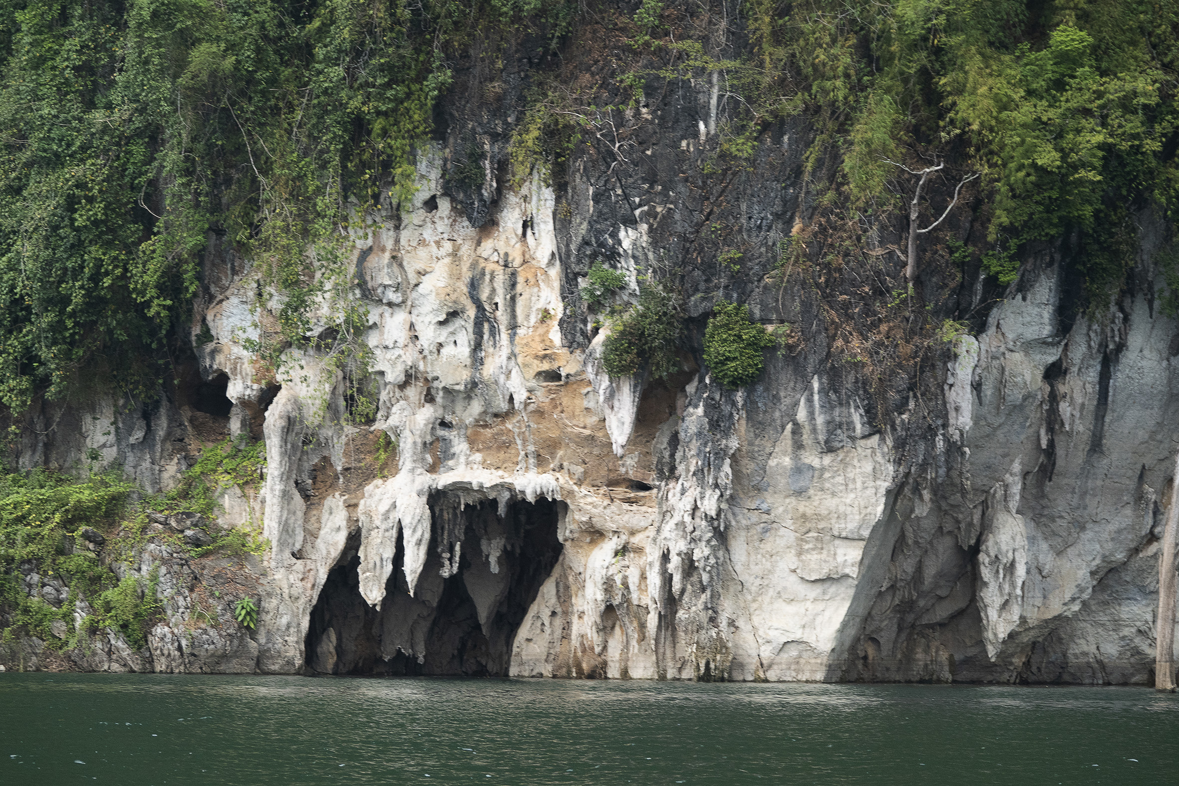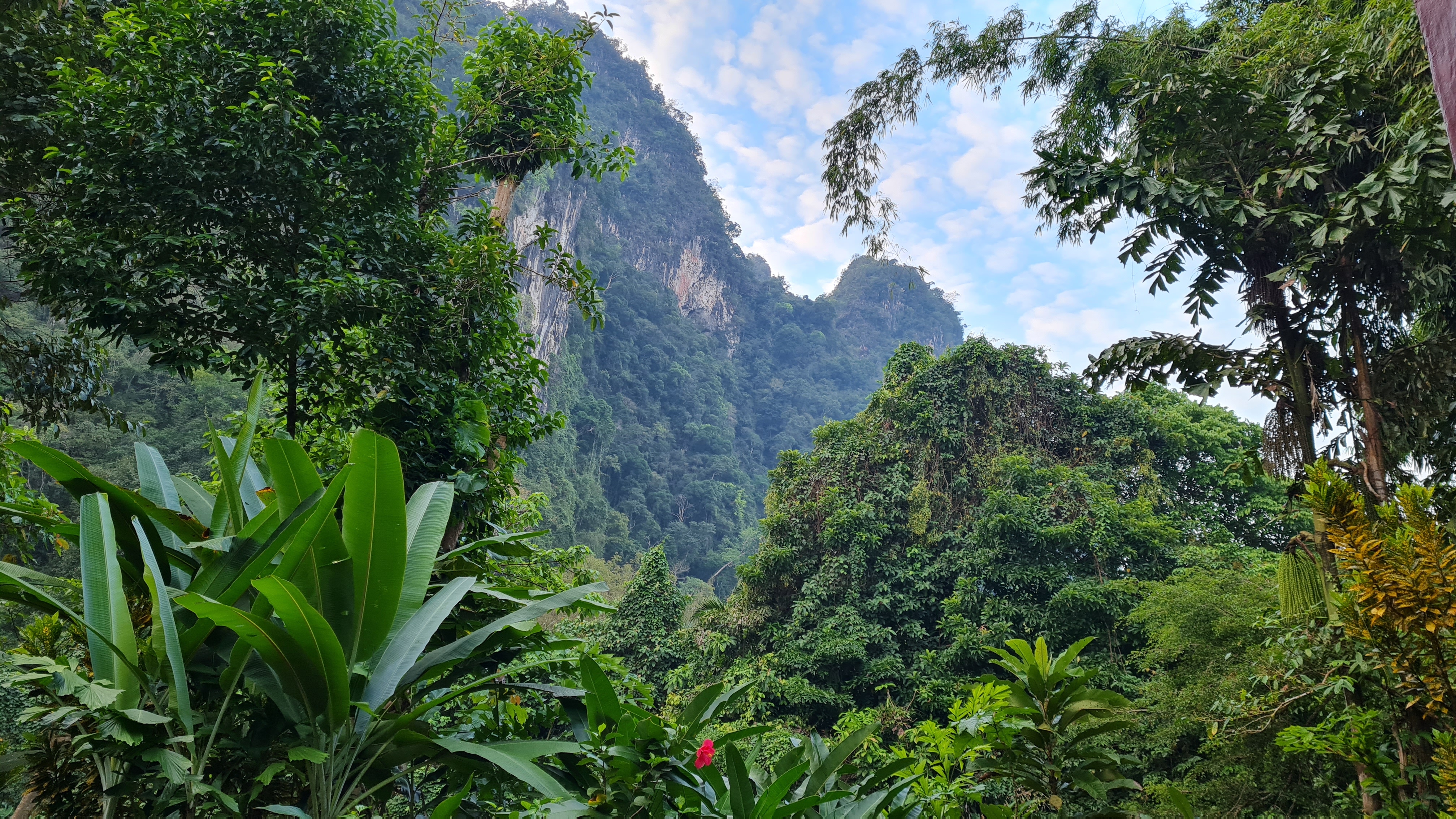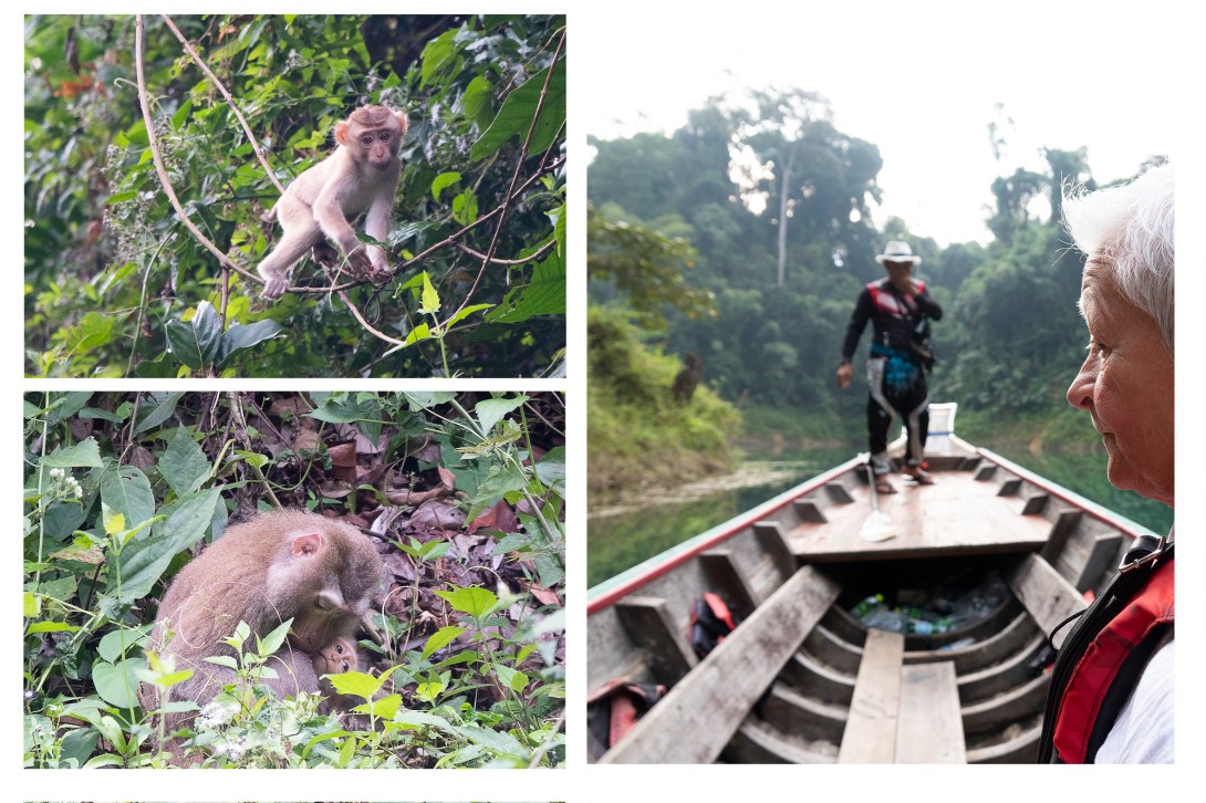 En biltur på drygt två timmar och vi var framme vid nästa anhalt på resan, Our Jungle Camp i Khao Soks nationalpark med övernattning i trädhotell . En vacker plats med höga berg ,frodig grönska och exotiska blommor men även kända krukväxter som här växer som buskar och träd. En extra djungeltur efter lunch blev bokad vilket visade sig vara ett misstag, inte mycket av intresse på turen om man inte är specialintresserad av spindel och skorpionbon och dessutom vickade jag mitt knä som grädde på moset. Trots allt fick vi en fin kväll på verandan på vårt trädhotell och somnade till ljudet av cikador och änder nere i floden som snattrade oavbrutet. Morgon därpå hämtades vi av guiden Chai för att åka till Cheow Lan Lake för en övernattning på en flytande bungalow , ett besök i en grotta med stalagmiter och stalaktiter, ännu en djungelvandring där vi lärde de oss allt om bambu och gummiträd… försedd med en vandringsstav och värktabletter så klarade jag den vandringen hyfsat och att en ev hungrig tiger som skulle finnas i närheten fick tanten att öka farten!