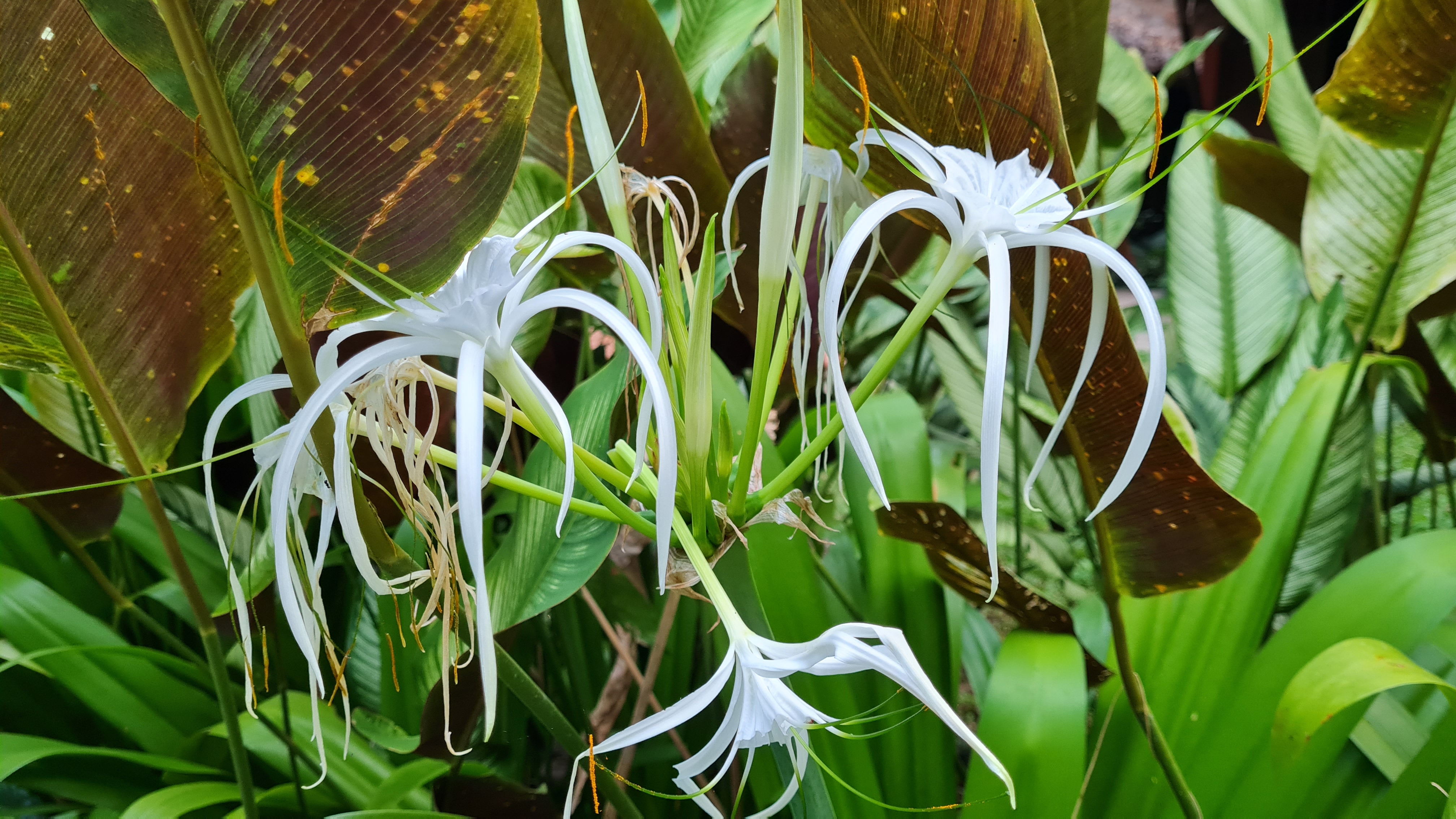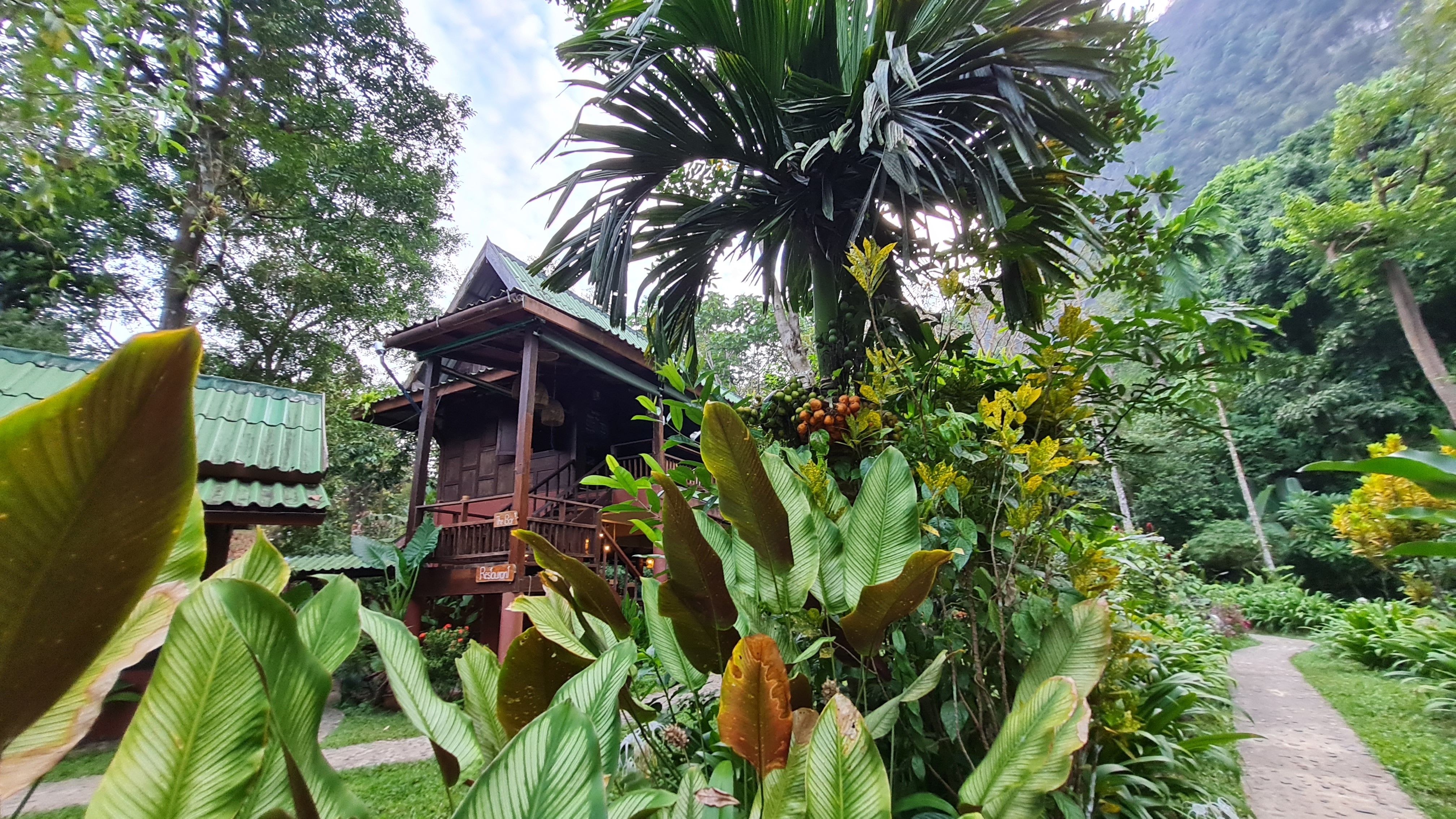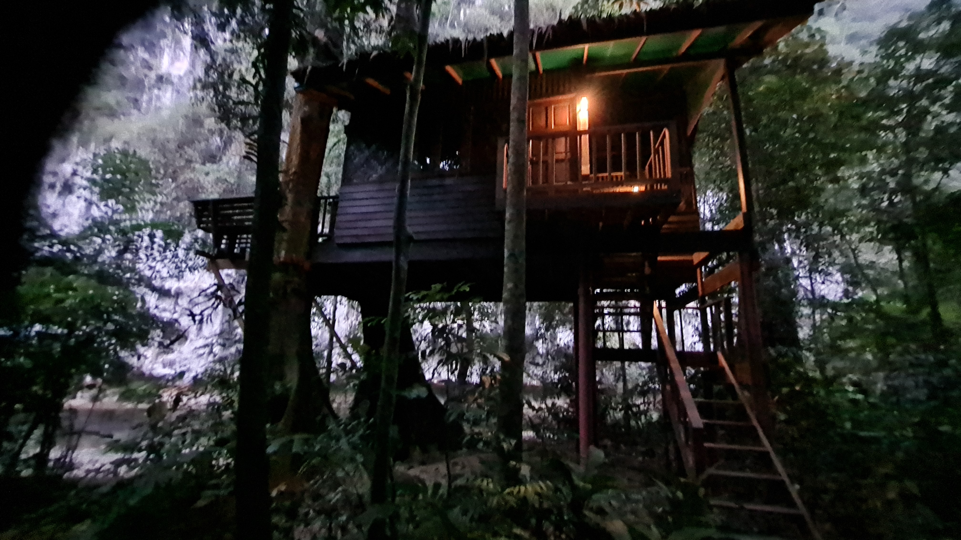 En biltur på drygt två timmar och vi var framme vid nästa anhalt på resan, Our Jungle Camp i Khao Soks nationalpark med övernattning i trädhotell . En vacker plats med höga berg ,frodig grönska och exotiska blommor men även kända krukväxter som här växer som buskar och träd. En extra djungeltur efter lunch blev bokad vilket visade sig vara ett misstag, inte mycket av intresse på turen om man inte är specialintresserad av spindel och skorpionbon och dessutom vickade jag mitt knä som grädde på moset. Trots allt fick vi en fin kväll på verandan på vårt trädhotell och somnade till ljudet av cikador och änder nere i floden som snattrade oavbrutet. Morgon därpå hämtades vi av guiden Chai för att åka till Cheow Lan Lake för en övernattning på en flytande bungalow , ett besök i en grotta med stalagmiter och stalaktiter, ännu en djungelvandring där vi lärde de oss allt om bambu och gummiträd… försedd med en vandringsstav och värktabletter så klarade jag den vandringen hyfsat och att en ev hungrig tiger som skulle finnas i närheten fick tanten att öka farten!
