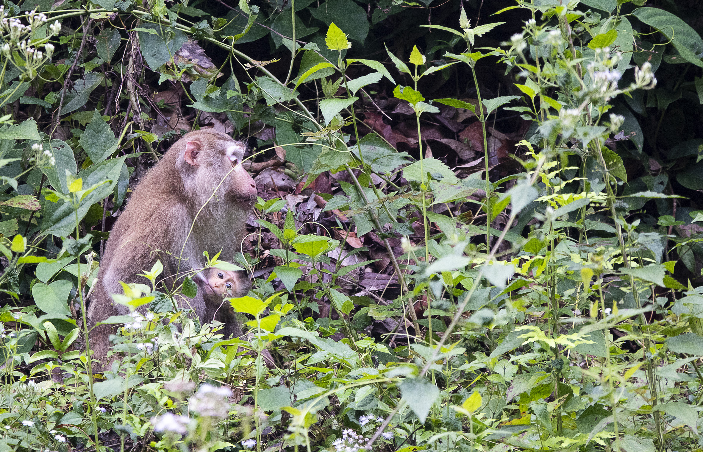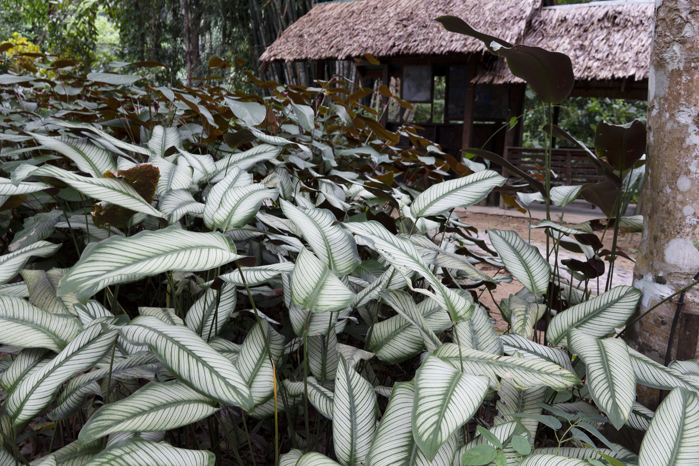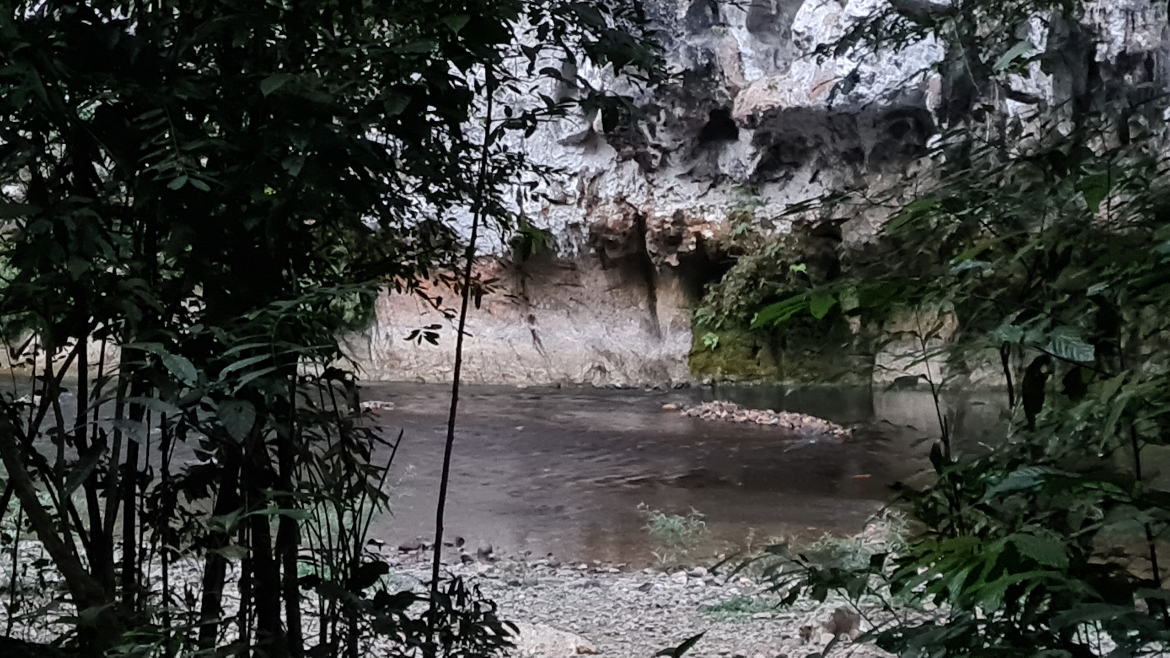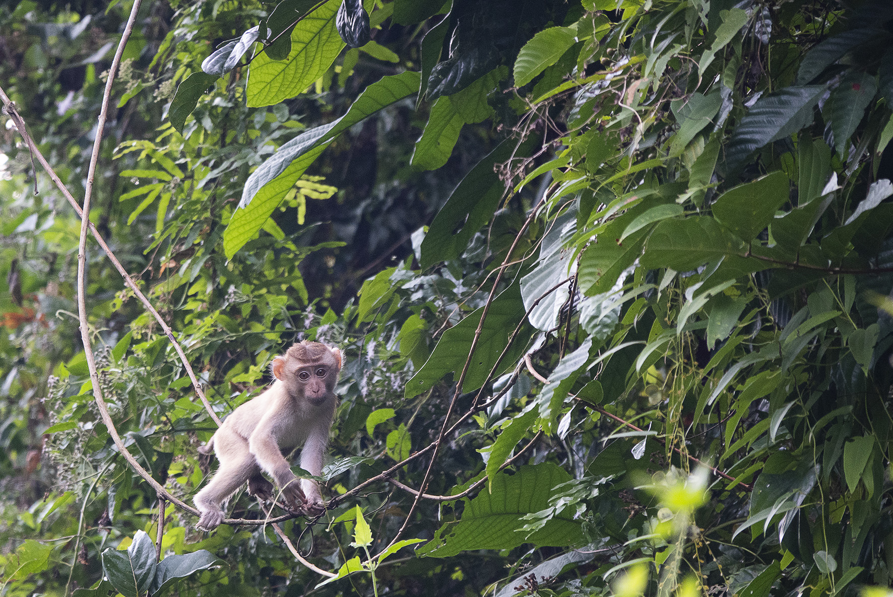 Sussade gott den natten på lugnt vatten. Tidigt uppe för en morgontur med hopp om att få se för att se vilda elefanter, det skulle finnas en liten hjord på tolv individer som man kunde se när de gick ner för att dricka, tyvärr hade vi inte den turen på vår sida. Hörde elefanterna och såg bambuträdens kronor vaja, så de var nära men väldigt svåra att se i all grönska. Vår guide tog en bild med min kamera och det går med god vilja att urskilja ett elefanthuvud i det gröna dunklet. Några nyfika apor fick vi i alla fall syn på, lekande unga makaker som svingade sig i lianerna och en skyggare mamma med sitt lilla barn. Så fina.