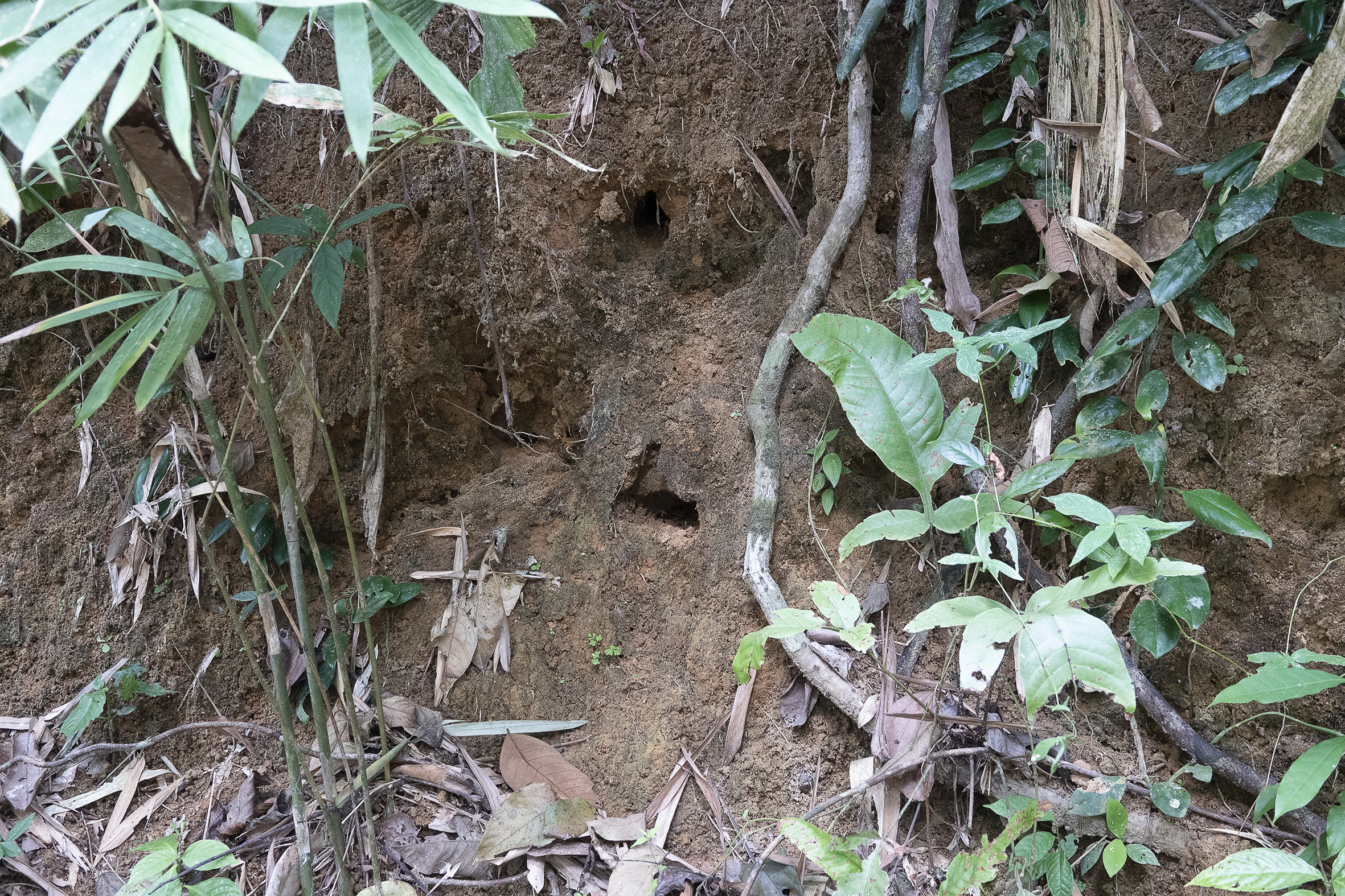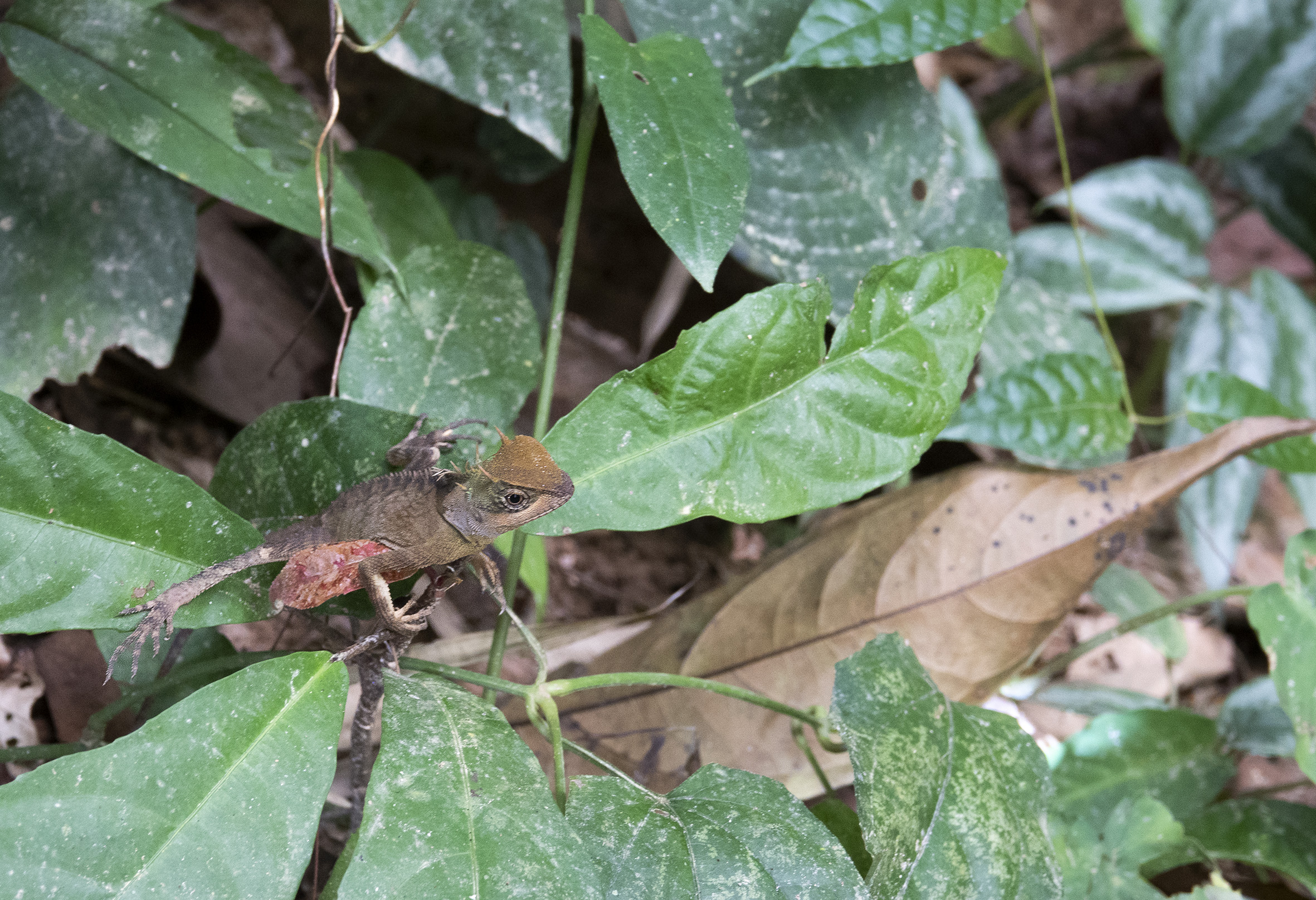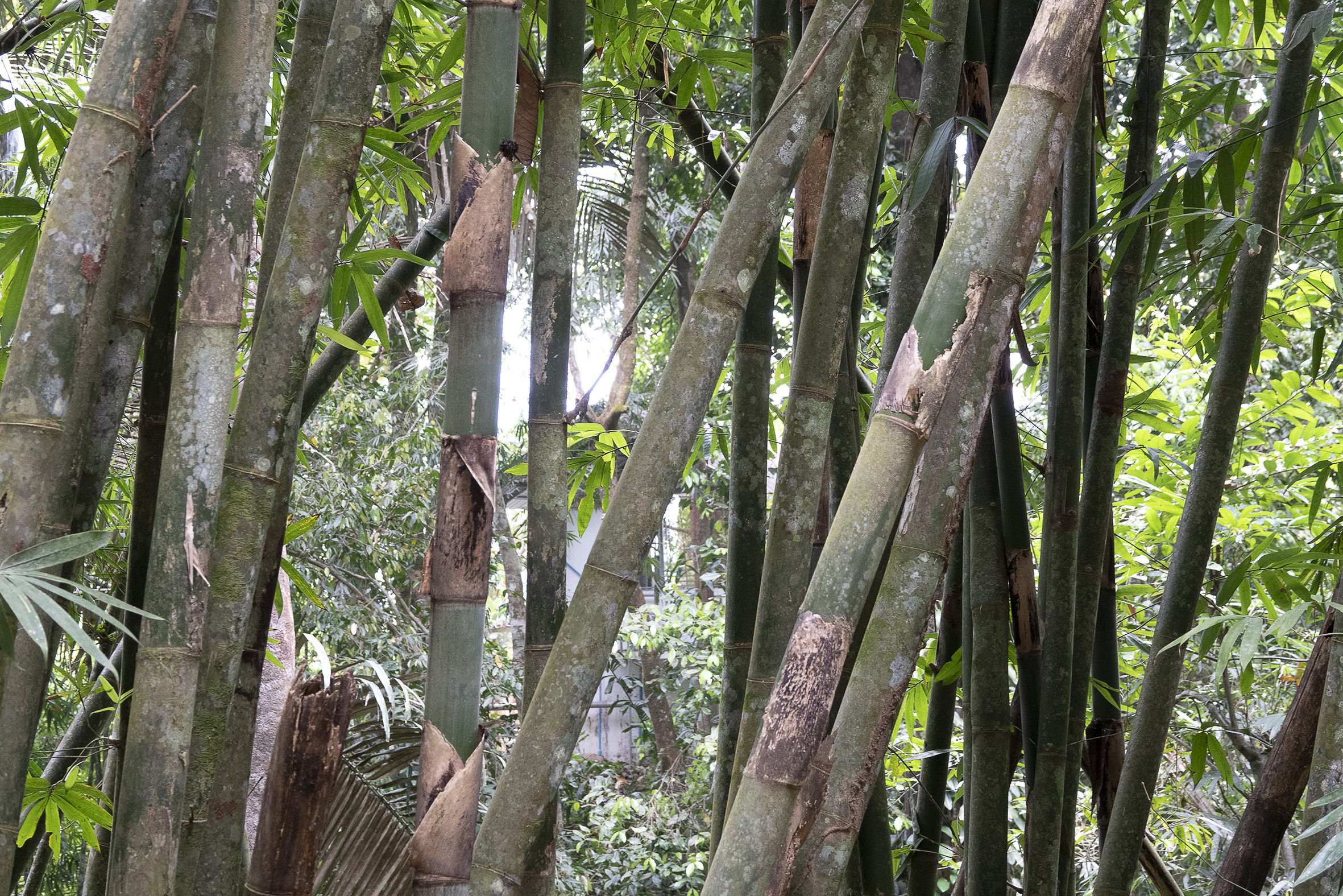 Sussade gott den natten på lugnt vatten. Tidigt uppe för en morgontur med hopp om att få se för att se vilda elefanter, det skulle finnas en liten hjord på tolv individer som man kunde se när de gick ner för att dricka, tyvärr hade vi inte den turen på vår sida. Hörde elefanterna och såg bambuträdens kronor vaja, så de var nära men väldigt svåra att se i all grönska. Vår guide tog en bild med min kamera och det går med god vilja att urskilja ett elefanthuvud i det gröna dunklet. Några nyfika apor fick vi i alla fall syn på, lekande unga makaker som svingade sig i lianerna och en skyggare mamma med sitt lilla barn. Så fina.