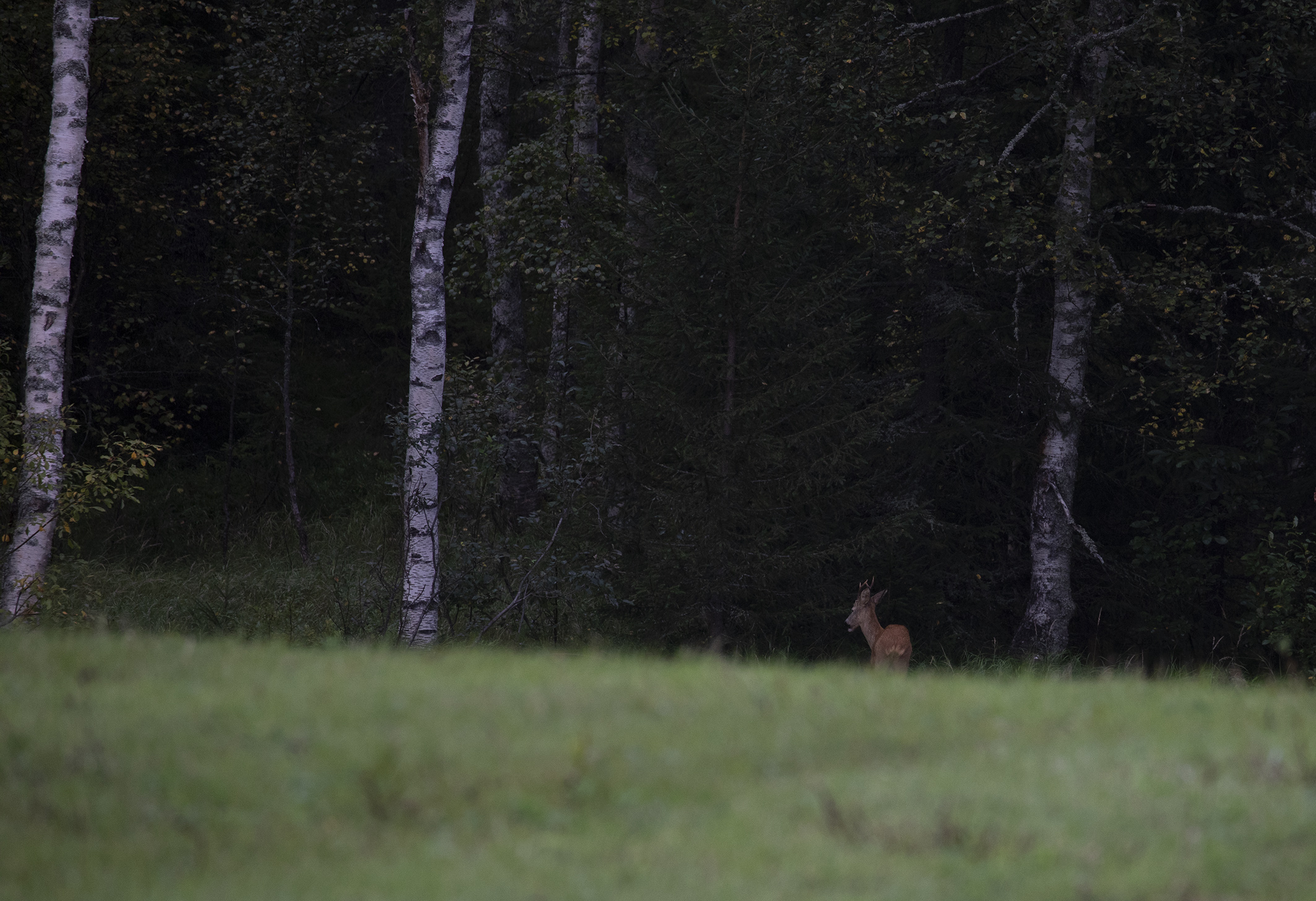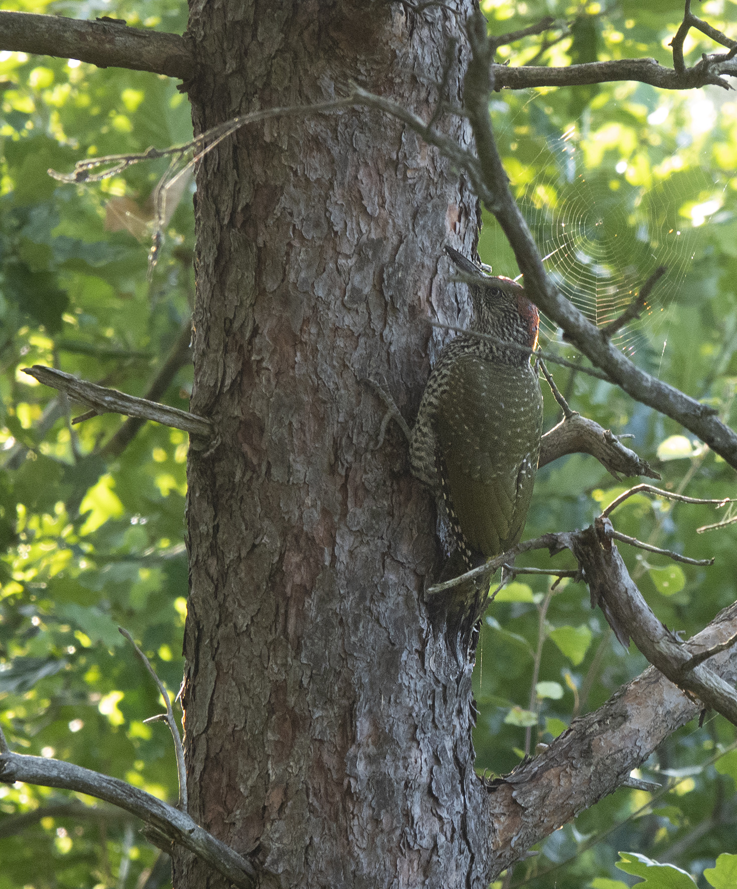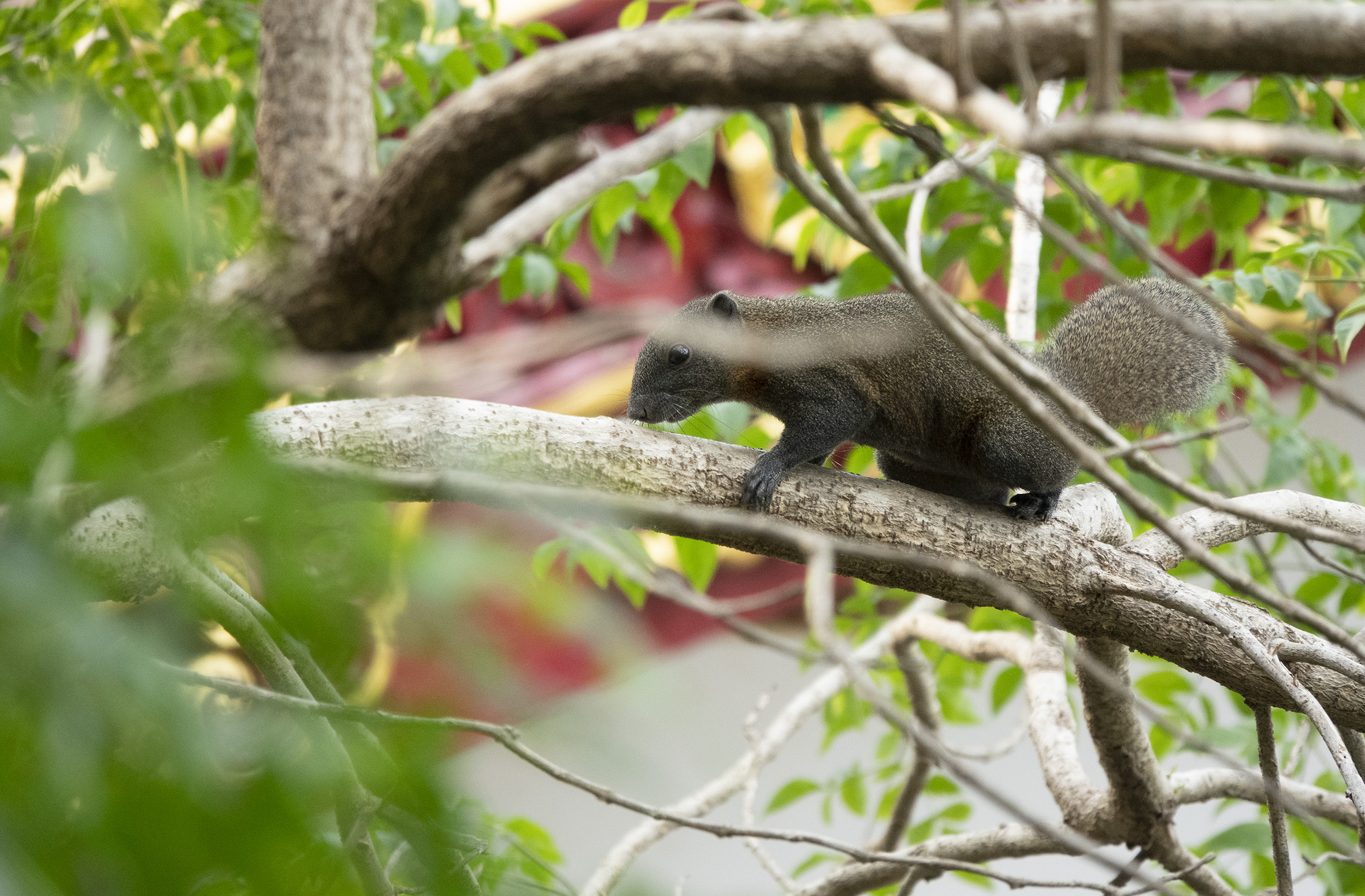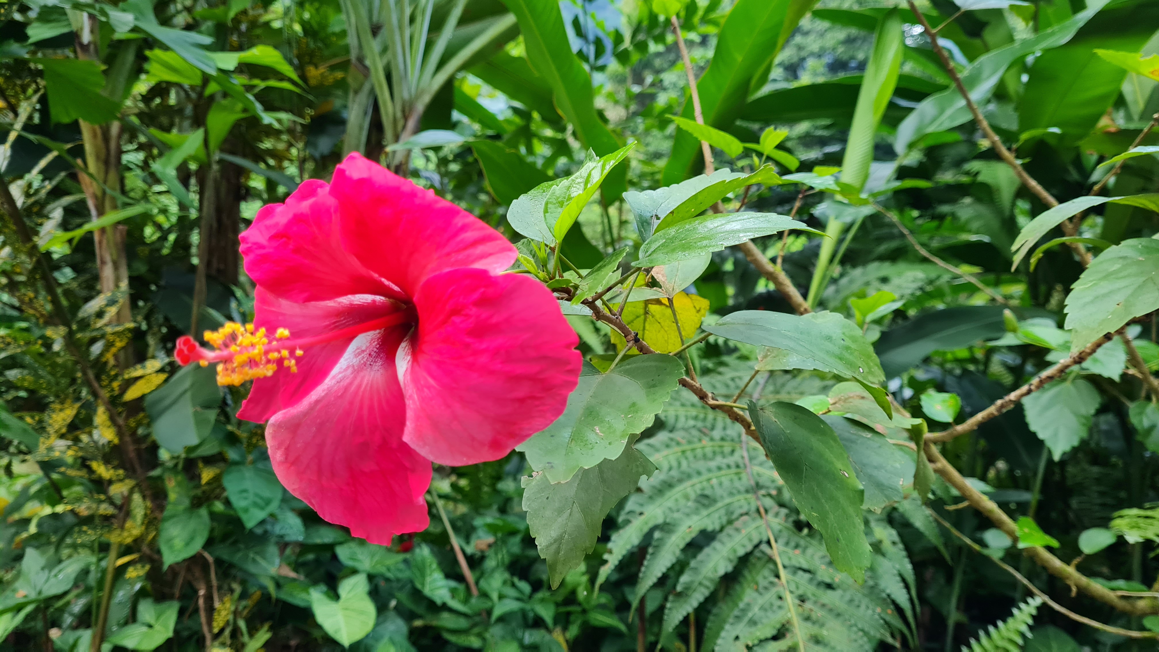 Sussade gott den natten på lugnt vatten. Tidigt uppe för en morgontur med hopp om att få se för att se vilda elefanter, det skulle finnas en liten hjord på tolv individer som man kunde se när de gick ner för att dricka, tyvärr hade vi inte den turen på vår sida. Hörde elefanterna och såg bambuträdens kronor vaja, så de var nära men väldigt svåra att se i all grönska. Vår guide tog en bild med min kamera och det går med god vilja att urskilja ett elefanthuvud i det gröna dunklet. Några nyfika apor fick vi i alla fall syn på, lekande unga makaker som svingade sig i lianerna och en skyggare mamma med sitt lilla barn. Så fina.