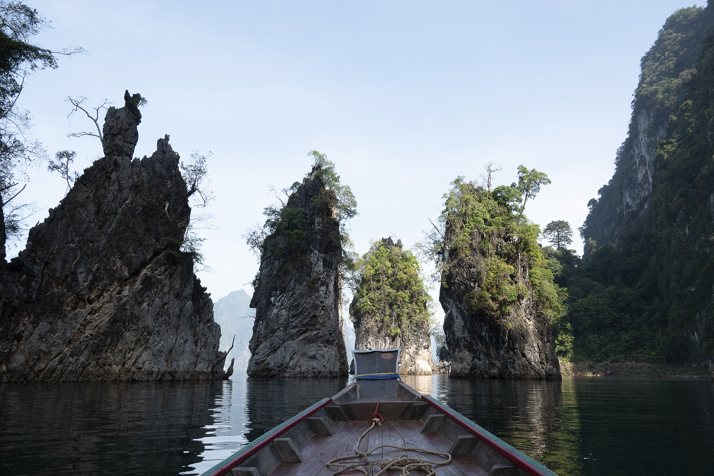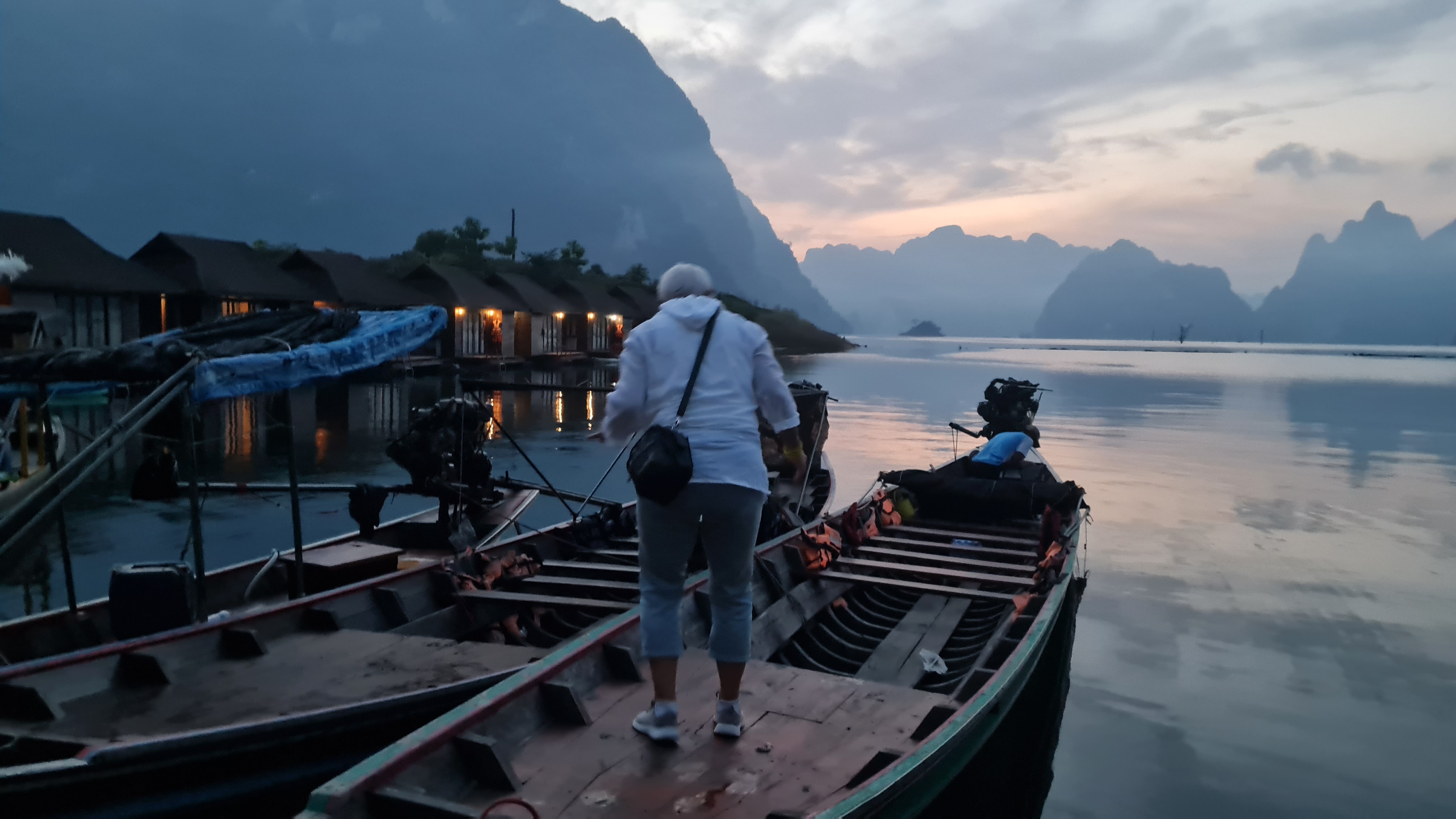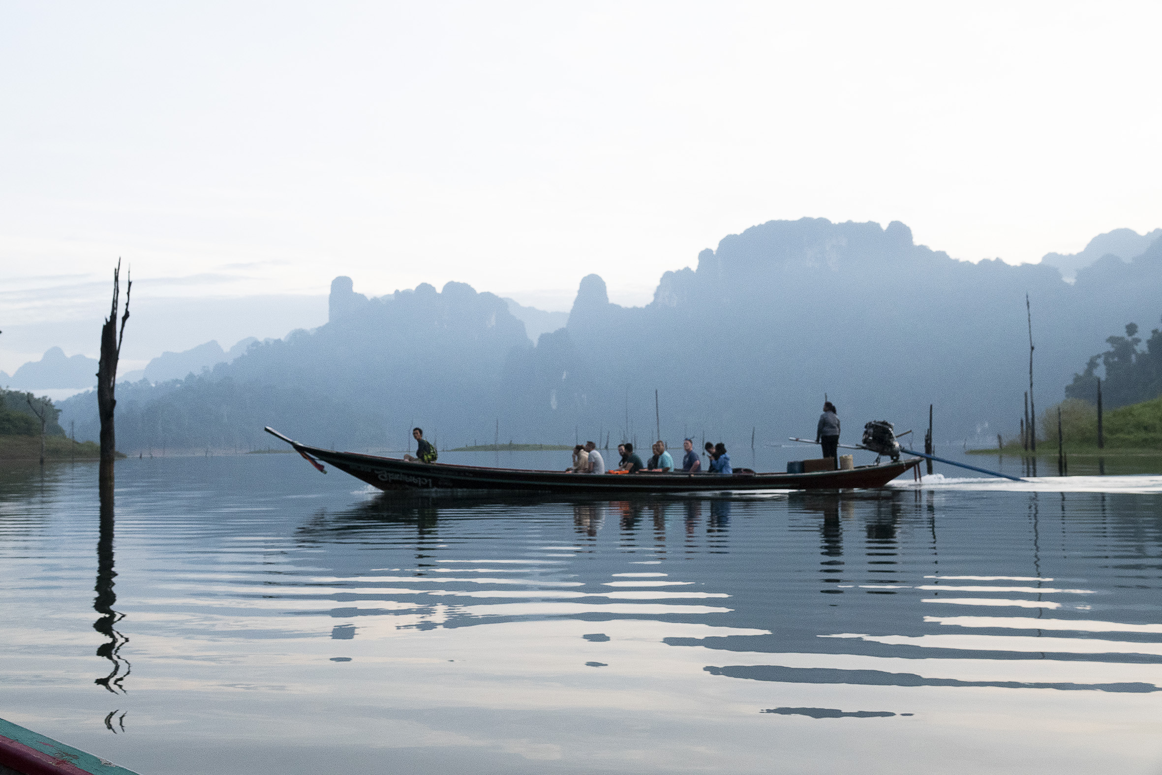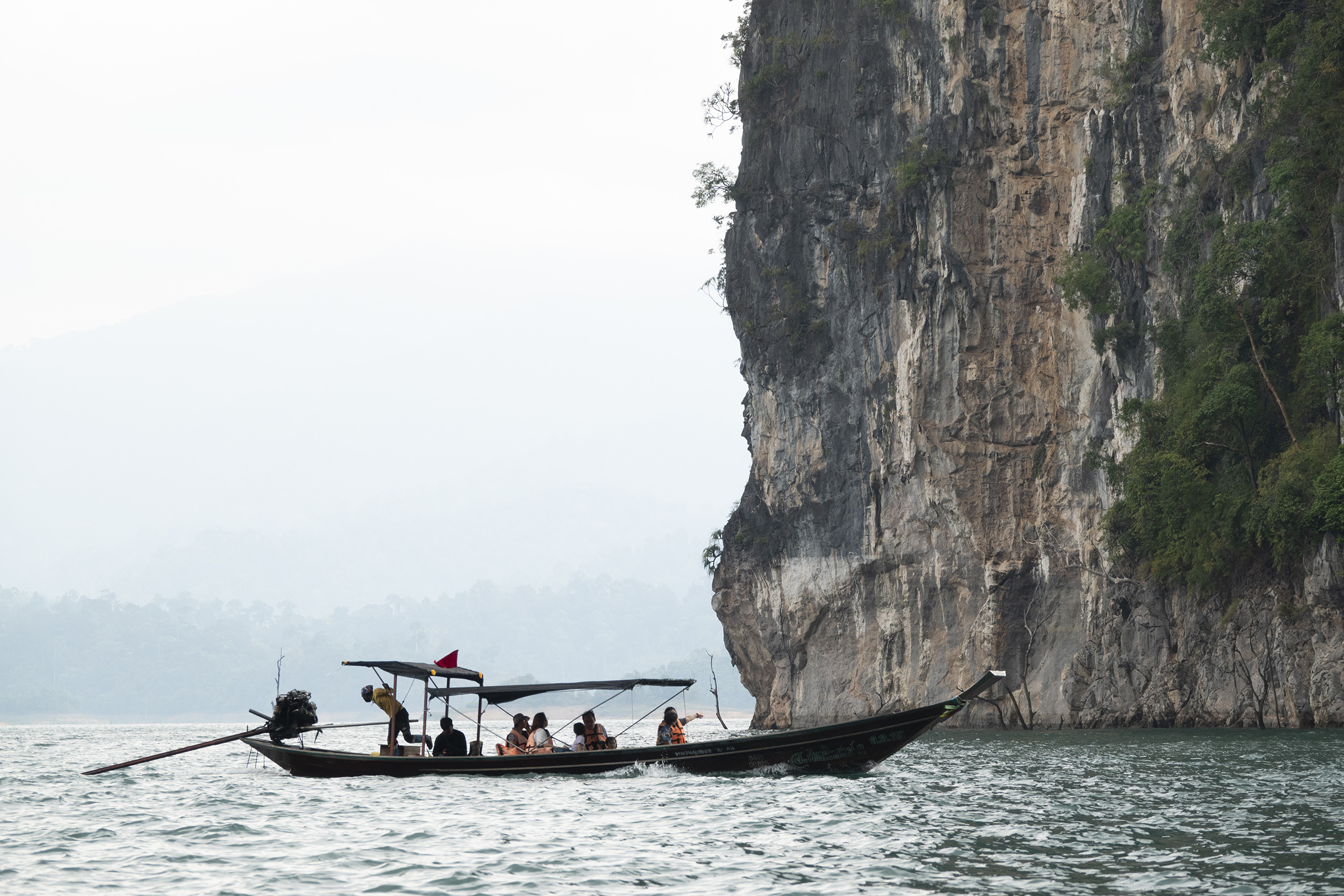 Både människor och djur har flyttats från stora områden som lagts under vatten för detta gigantiska dammprojekt .Väldigt speciellt landskap med de höga smala klippformationerna och svårt att tänka sig hur det såg ut innan detta blev Cheow Lan Lake. Sjön har ett djup på 90 meter som mest . På vägen tillbaka åkte vi till några speciella kalkstensformationer i de traditionella långriggade båtarna som är ganska ranka, det gällde att sitta still mitt i båten och med obligatorisk flytväst på! Hemgjord kokosglass kunde man köpa ute på sjön, vilken lyx! Tillbaka till verkligheten, steg vi iland och åkte till sista anhalten på resan Khao Lak