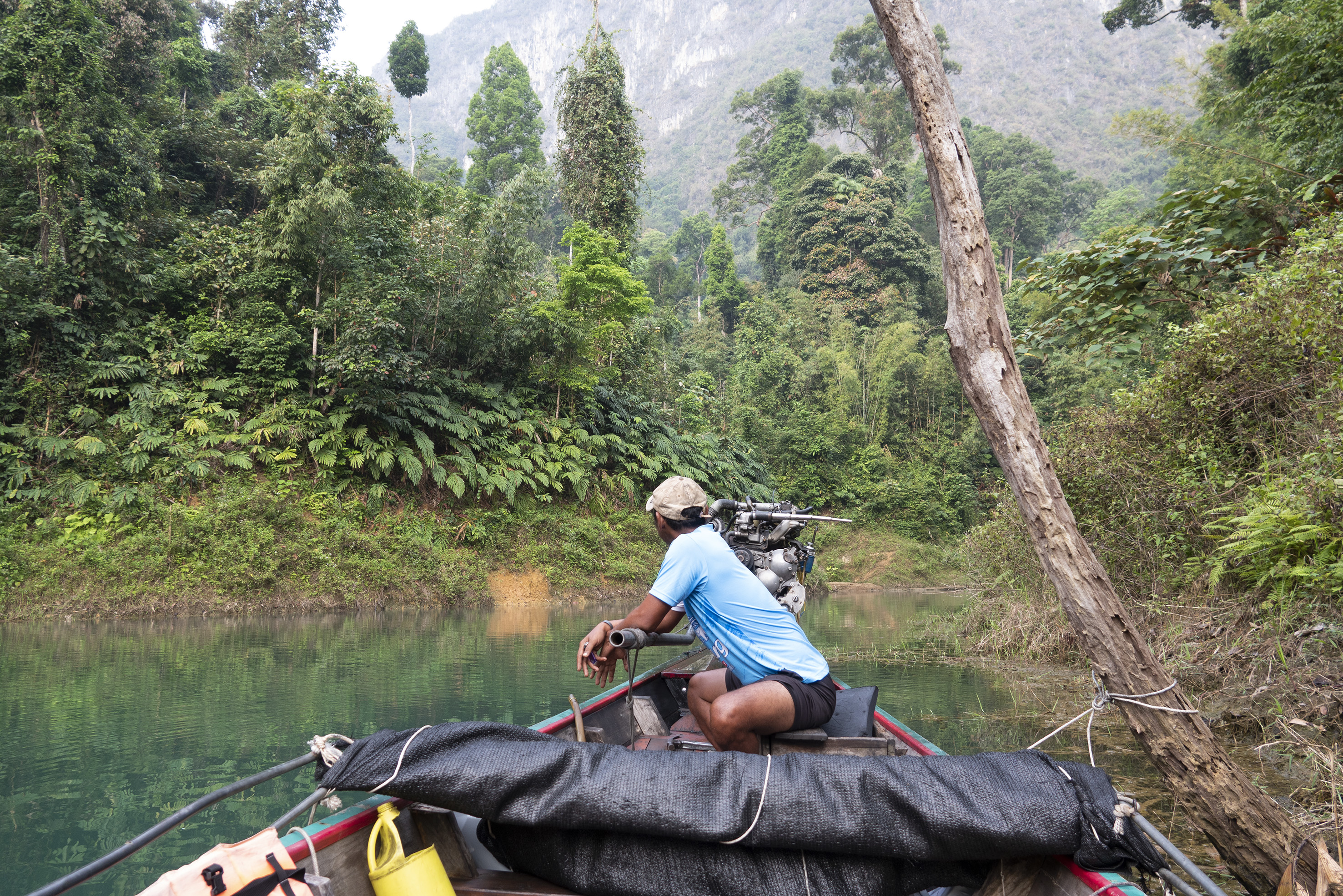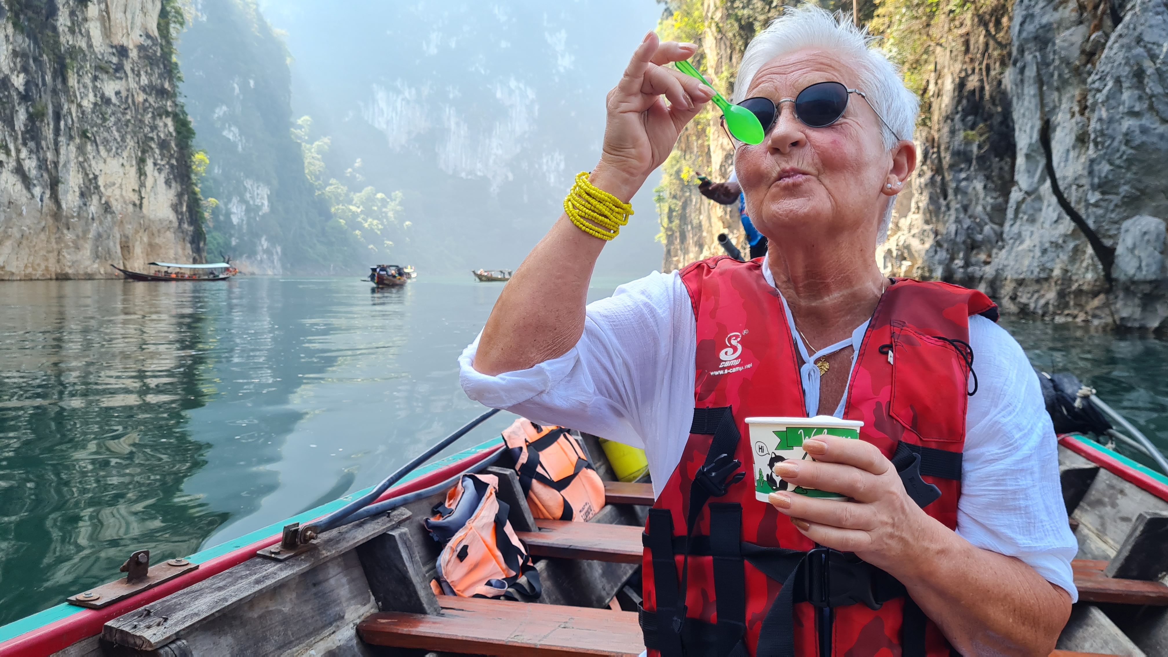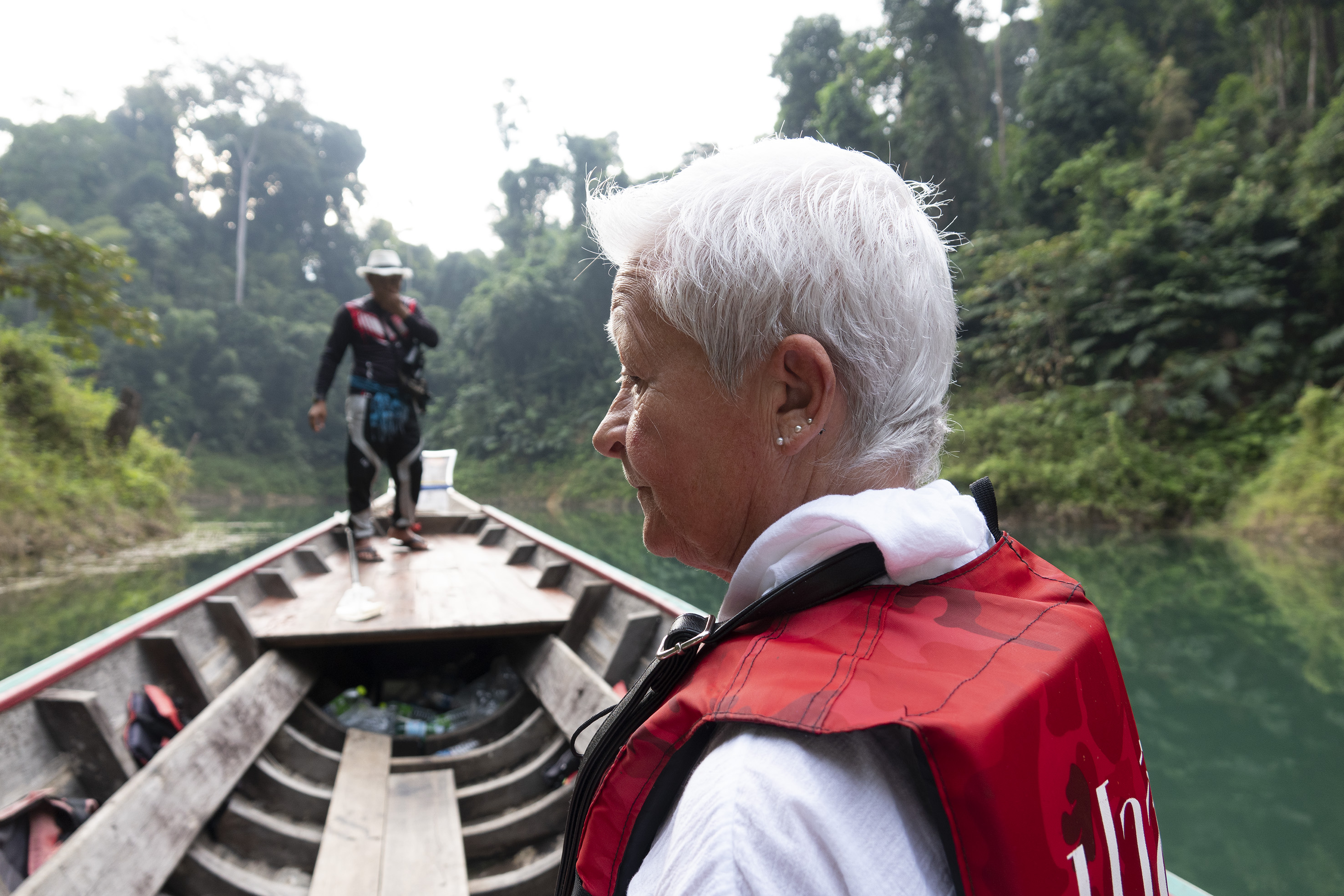 Både människor och djur har flyttats från stora områden som lagts under vatten för detta gigantiska dammprojekt .Väldigt speciellt landskap med de höga smala klippformationerna och svårt att tänka sig hur det såg ut innan detta blev Cheow Lan Lake. Sjön har ett djup på 90 meter som mest . På vägen tillbaka åkte vi till några speciella kalkstensformationer i de traditionella långriggade båtarna som är ganska ranka, det gällde att sitta still mitt i båten och med obligatorisk flytväst på! Hemgjord kokosglass kunde man köpa ute på sjön, vilken lyx! Tillbaka till verkligheten, steg vi iland och åkte till sista anhalten på resan Khao Lak