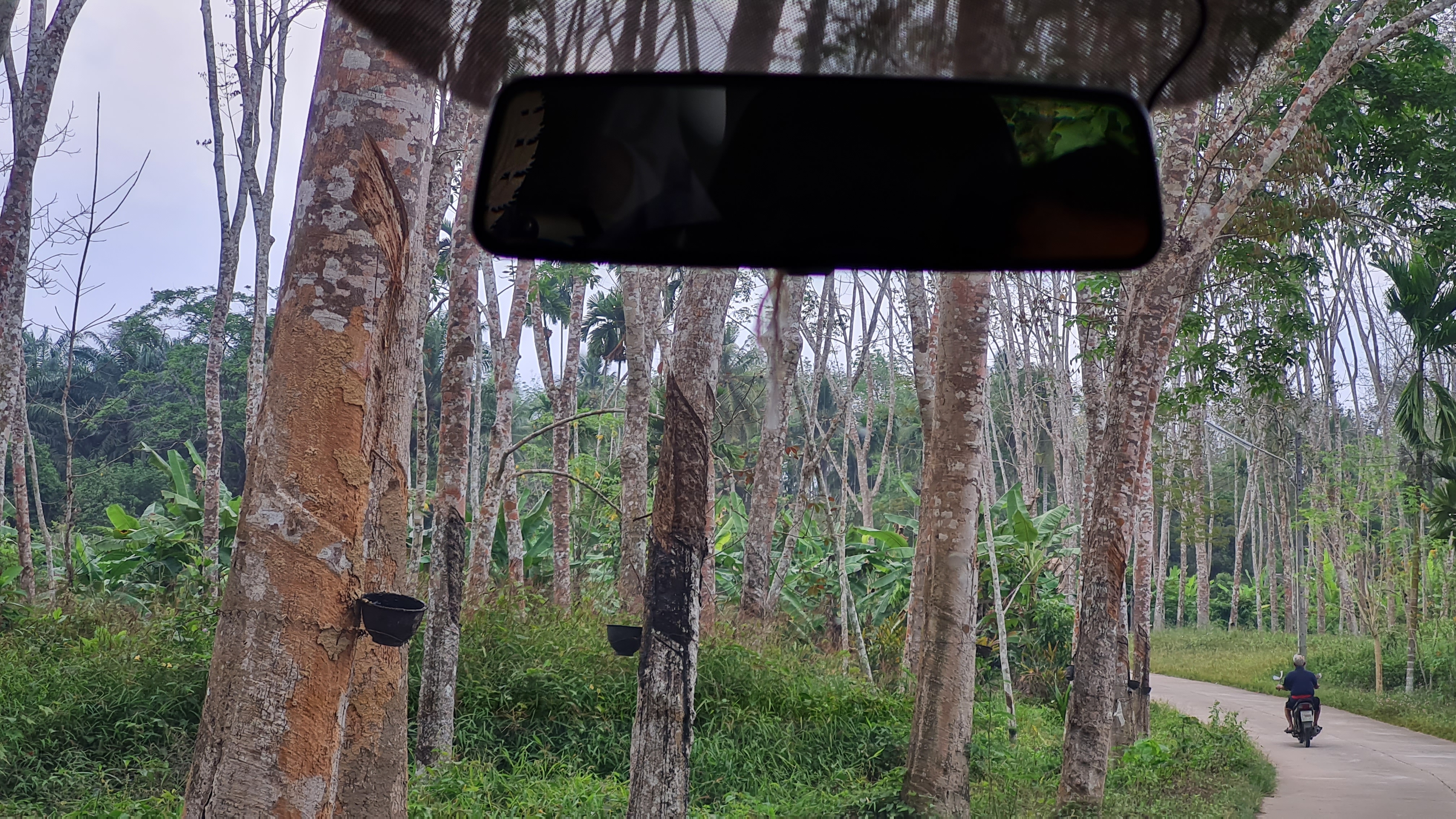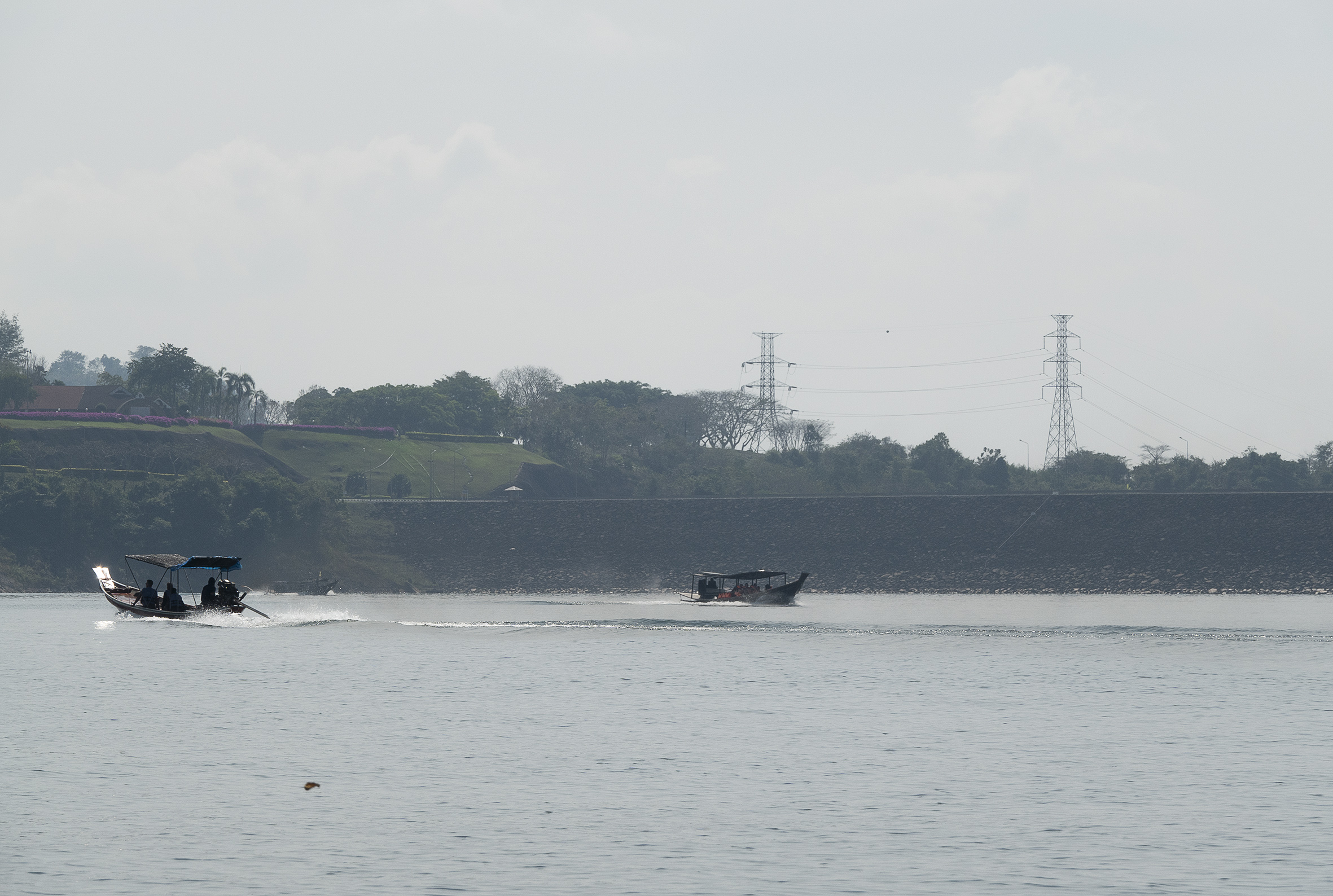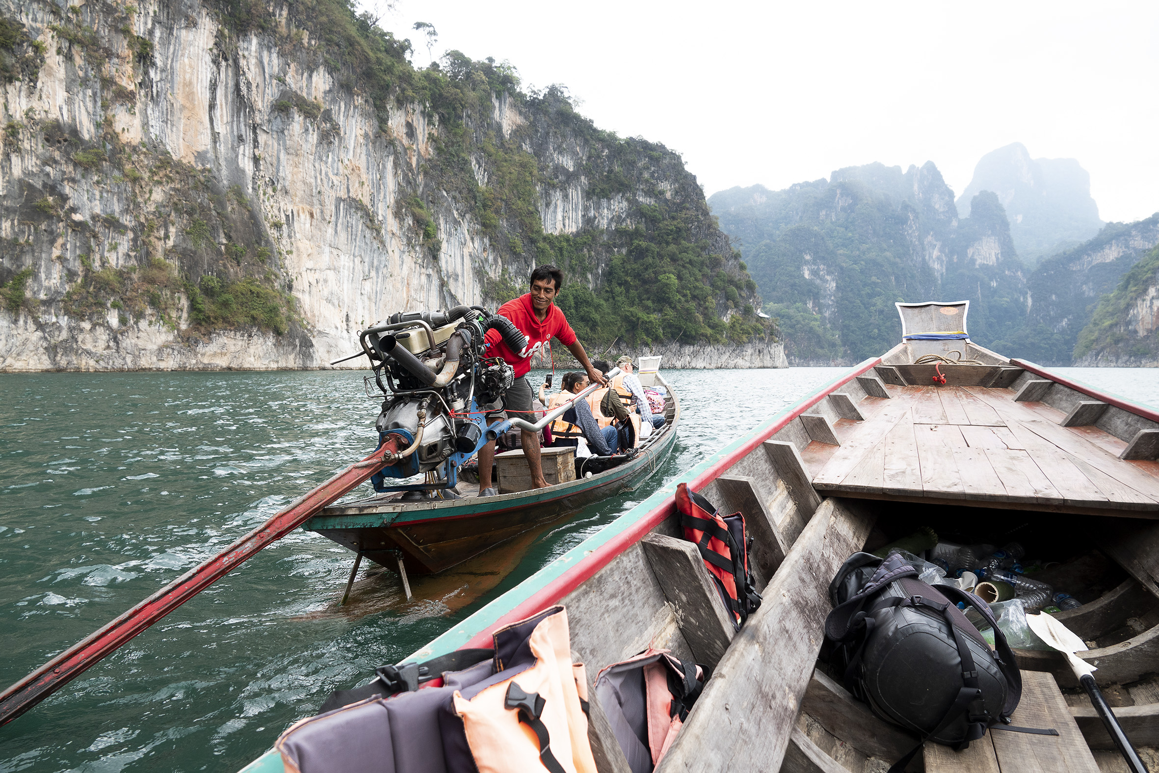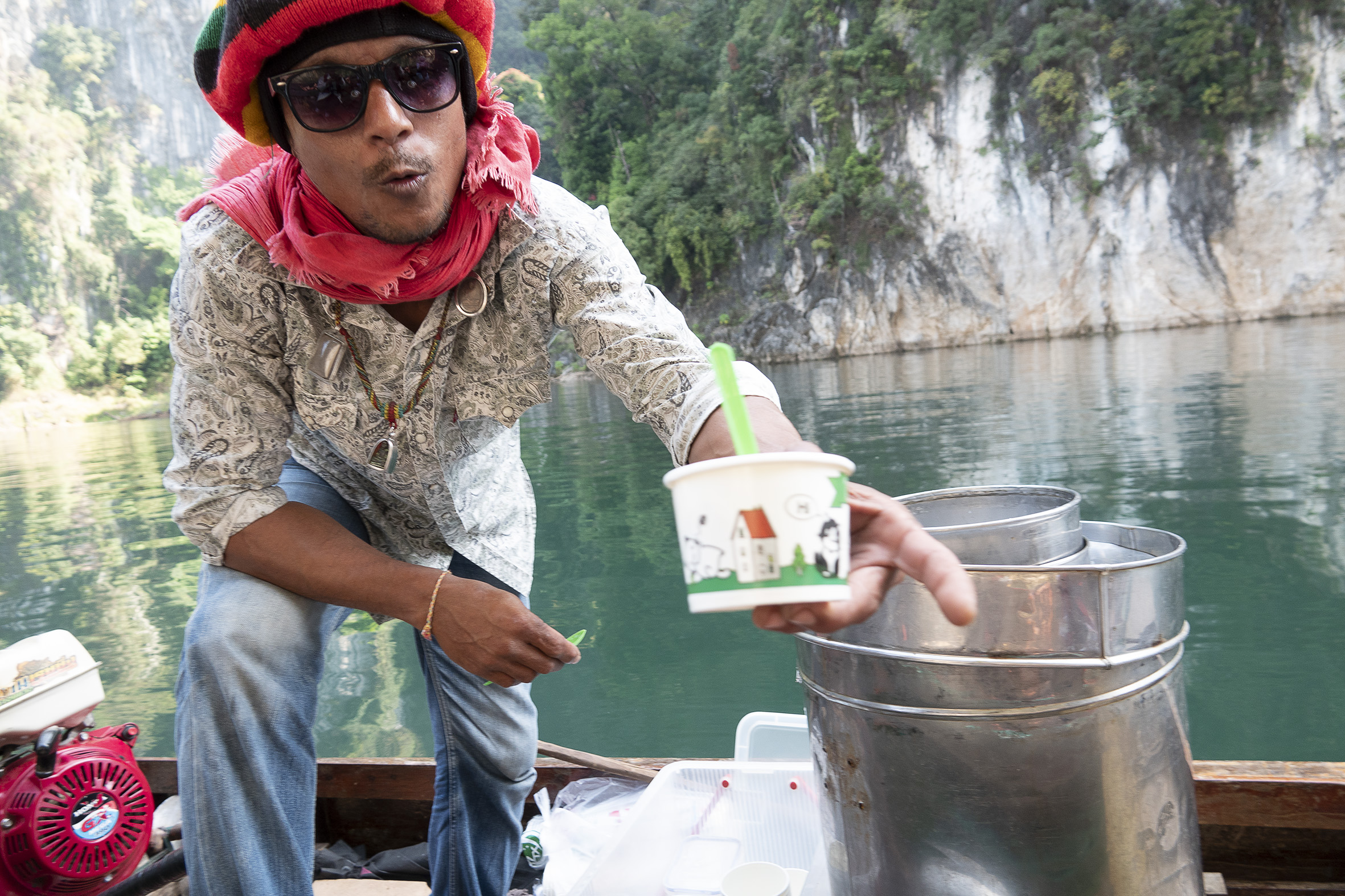 Både människor och djur har flyttats från stora områden som lagts under vatten för detta gigantiska dammprojekt .Väldigt speciellt landskap med de höga smala klippformationerna och svårt att tänka sig hur det såg ut innan detta blev Cheow Lan Lake. Sjön har ett djup på 90 meter som mest . På vägen tillbaka åkte vi till några speciella kalkstensformationer i de traditionella långriggade båtarna som är ganska ranka, det gällde att sitta still mitt i båten och med obligatorisk flytväst på! Hemgjord kokosglass kunde man köpa ute på sjön, vilken lyx! Tillbaka till verkligheten, steg vi iland och åkte till sista anhalten på resan Khao Lak
