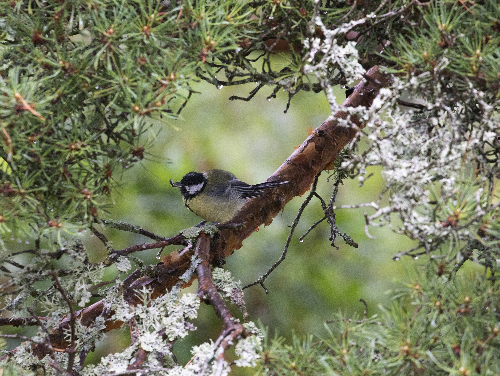 Sussade gott den natten på lugnt vatten. Tidigt uppe för en morgontur med hopp om att få se för att se vilda elefanter, det skulle finnas en liten hjord på tolv individer som man kunde se när de gick ner för att dricka, tyvärr hade vi inte den turen på vår sida. Hörde elefanterna och såg bambuträdens kronor vaja, så de var nära men väldigt svåra att se i all grönska. Vår guide tog en bild med min kamera och det går med god vilja att urskilja ett elefanthuvud i det gröna dunklet. Några nyfika apor fick vi i alla fall syn på, lekande unga makaker som svingade sig i lianerna och en skyggare mamma med sitt lilla barn. Så fina.