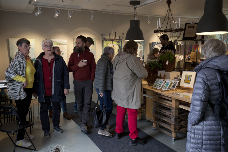 Mycket arbete för en kort tid med samtidigt helt fantastiskt att få träffas och trivas med konsten och konstnärerna som finns på plats! K-i-n s Konstrunda – ett fantastiskt arrangemang som borde lyftas fram i media och stöttas av de kommuner som berörs! Konstrundan organiseras och marknadsförs via K-i-n ( Konstnärer i Norrbotten) och anordnas helt av konstnärerna själva i de flesta fall, man bjuder på fika och goda samtal om konsten och ibland helt andra aspekter på livet. I den här formen borde vi mötas mycket oftare! Nyfiket , anspråkslöst och glatt! Bussresan från Luleå är gratis för konstbesökare som vill få en heldag i konstens tecken! Vilken lycka! Det minsta kommunerna borde göra är att bidra med marknadsföring kring eventetet som drar många besökare till kommunen. Vi på Lejonsgatan 4 c i Kalix hade 180 besökare! En liten kostnad som ger ett stort mervärde och goodwill för kommunen! Bättring Kalix kommun till nästa år!