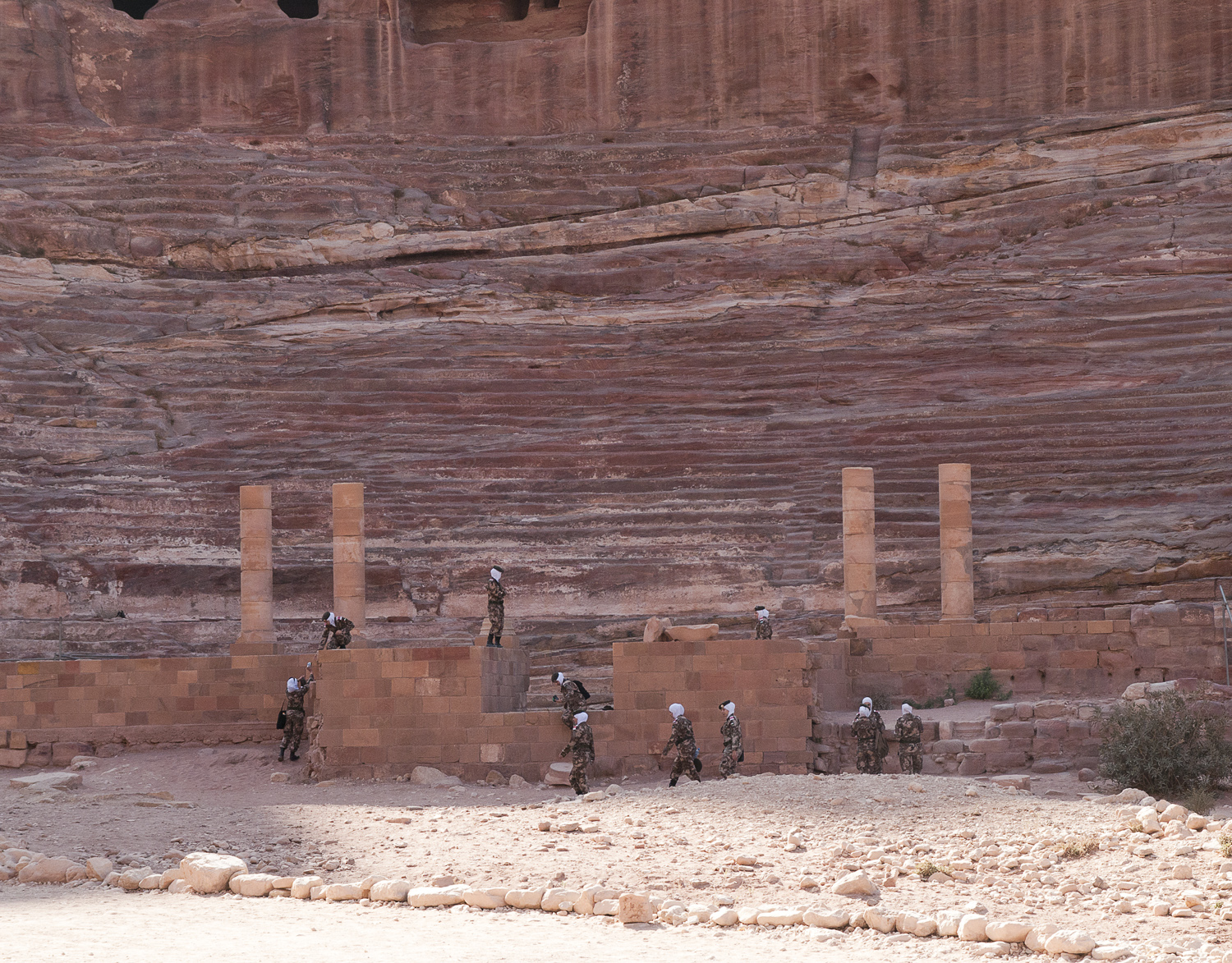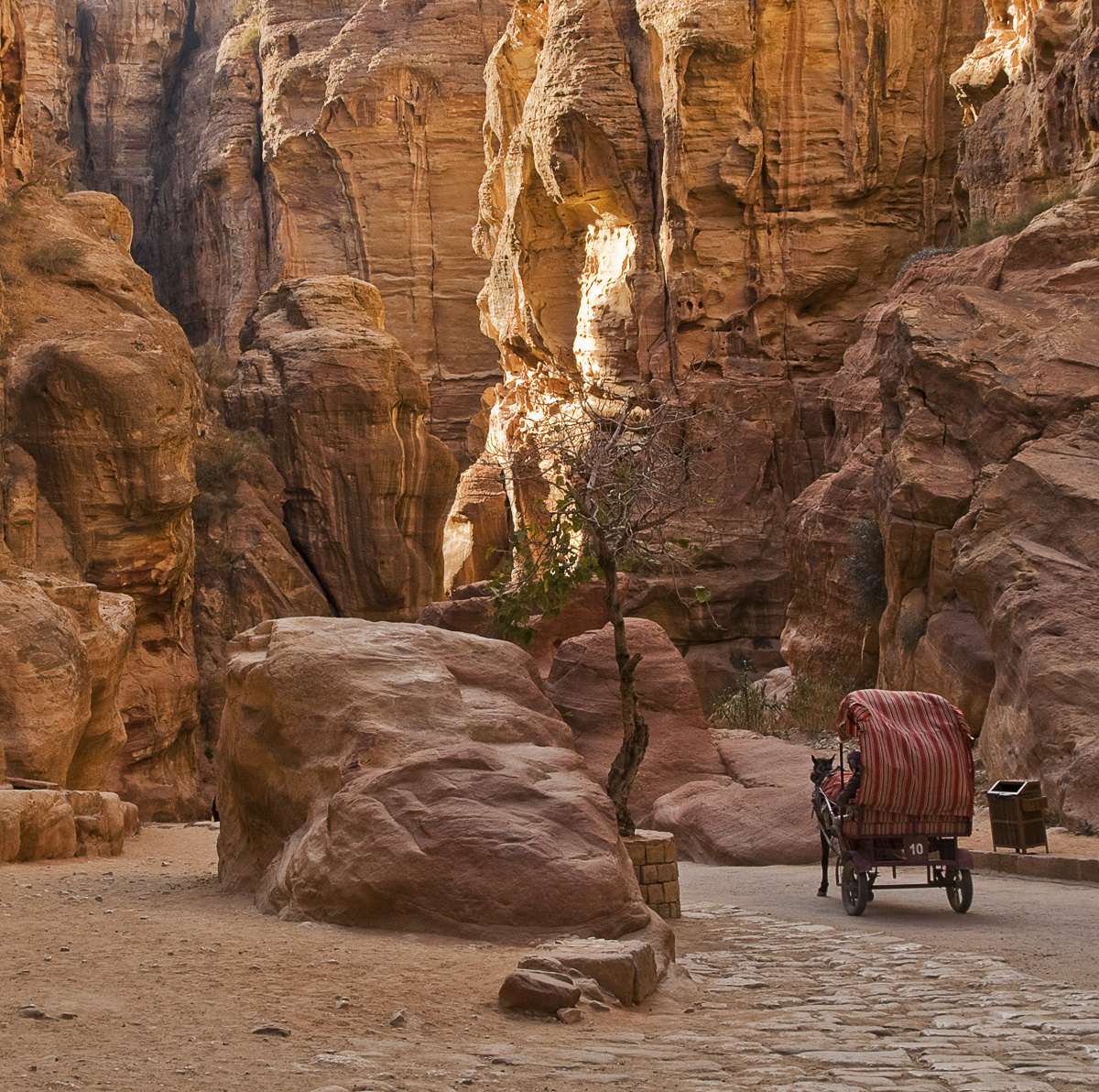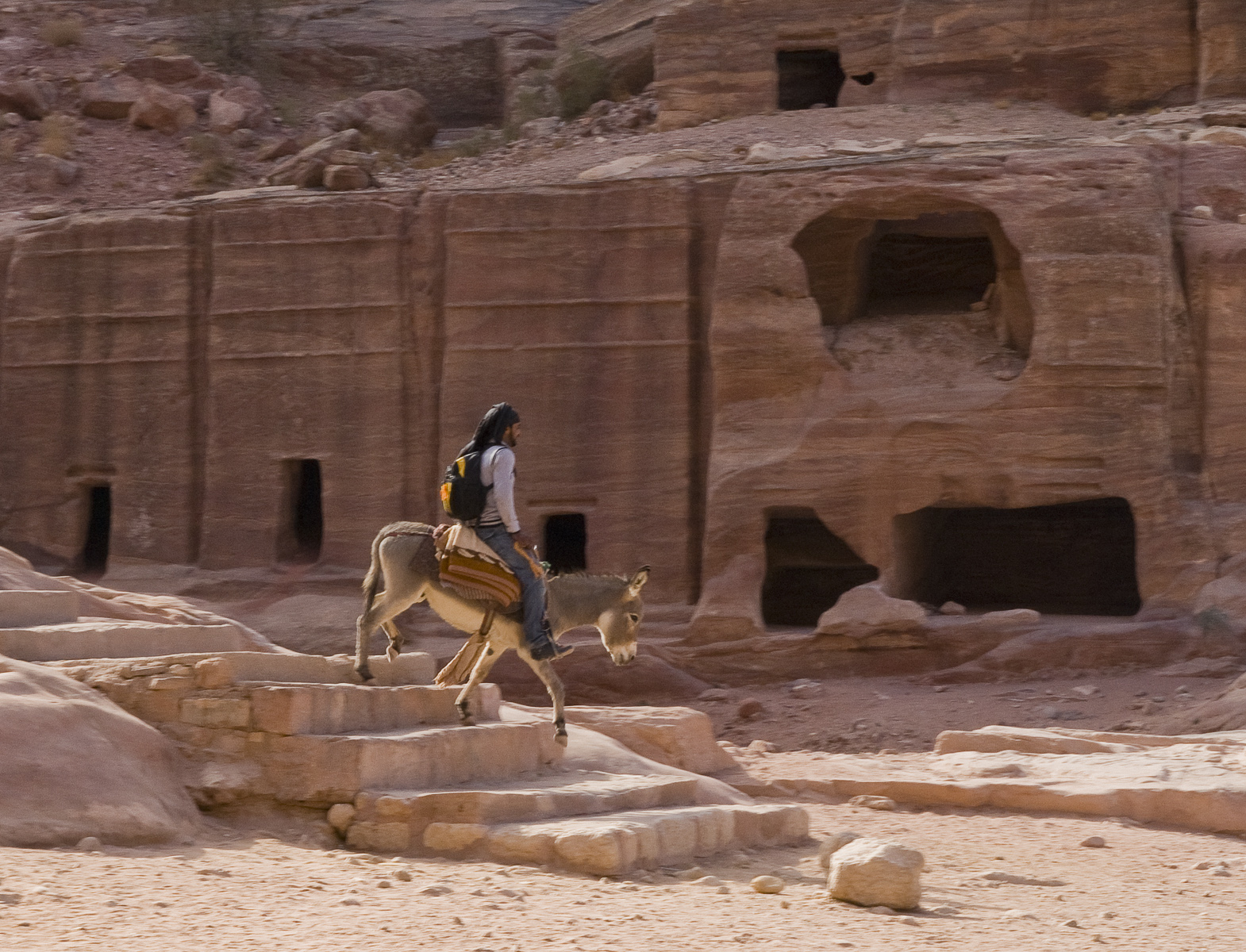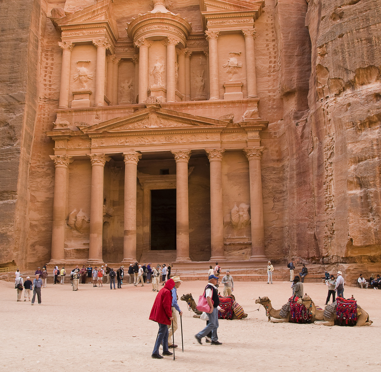 En dag i klippstaden Petra – Mycket varmt och en lång väg att vandra …så det var en och annan turist som valde ”taxi tillbaka” på kamelryggen eller hästdroska! Helt är makalöst att gå den långa vägen genom klippmassiven med bara en blå strimma av himmelen högt ovan, uthuggna skulpturer, vattenkanaler efter klippväggarna, bredare partier med mötesplatser och tillsist öppnas klippväggen och du ser det berömda vyn och staden med alla dess delar som blev ytterligare känt via filmen med Indiana Jones. Petra byggdes 200 år f Kr och var en storstad med 30.0000 invånare. Centrum för nabatéernas kungadöme och därifrån kontrollerade man handelsvägarna från Indien och Kina och södra Arabien till Rom ,Grekland och Egypten. Häftigt och känslan av karavanerna drar förbi finns kvar. Vi var många som besökte Petra den dagen bl.a kvinnliga jordanska rekryter tillsammans turistgrupper från världens olika hörn på besök i beduinernas land. En oförglömlig dag i kulturhistoriens vagga.